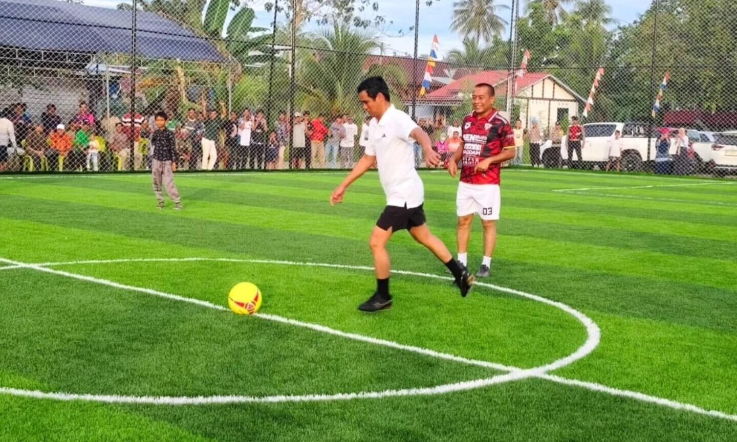 Bupati Nunukan melakukan tendangan perdana sebagai tanda diresmikanya mini soccer di Sebatik Barat
