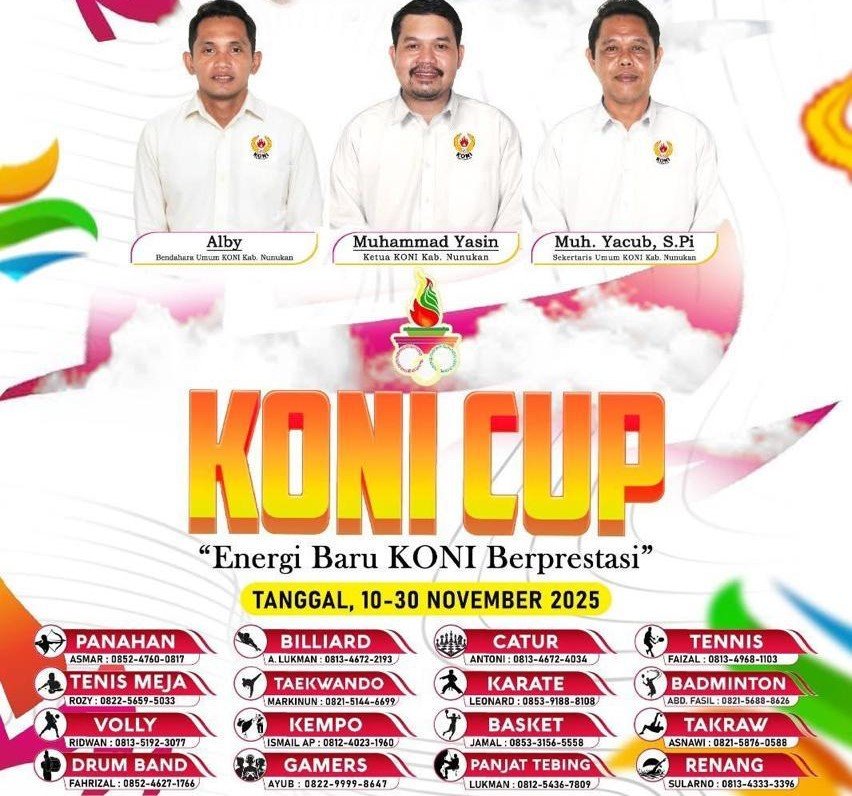 “Ajang persiapan pencarian bakat atlet muda KONI Cup dilaksanakan mulai tanggal 27 sampai 30 November 2025 melibatkan 16 Cabor,” kata Ketua KONI Nunukan, Muhammad Yasin, Kamis (13/11/2205).