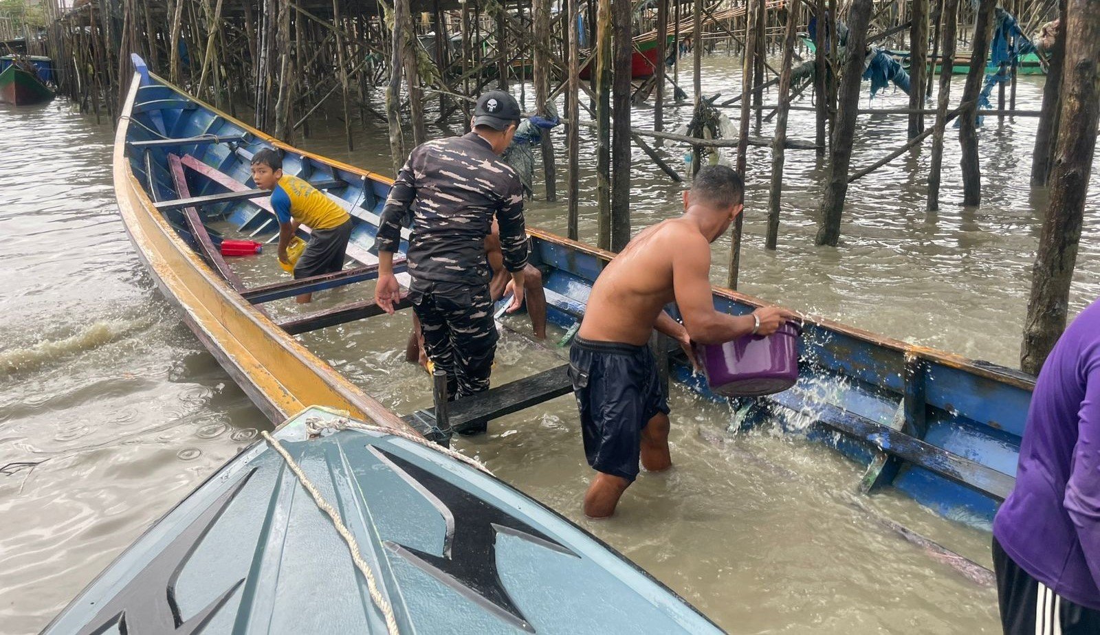 NUNUKAN.LK – Personel Pangkalan TNI AL (Lanal) Nunukan membantu evakuasi penyelamatan tiga unit perahu yang tenggelam akibat cuaca buruk dan ombak besar di depan perairan Yamaker Kecamatan Nunukan.