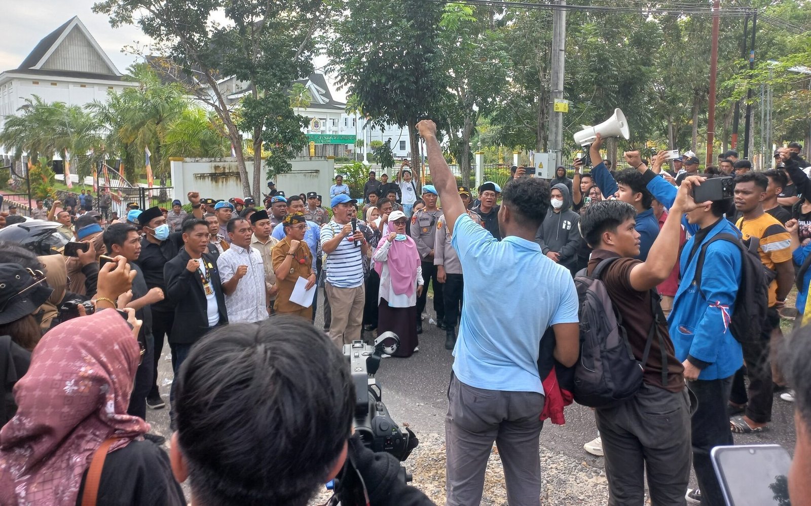 Aksi unjuk rasa yang dimulai sejak pagi di Tugu Dwikora Nunukan terus meluas hingga ke gedung DPRD Nunukan, teriakan orasi menggema meminta anggota DPRD Nunukan, hadir menerima kedatangan mahasiswa.